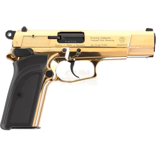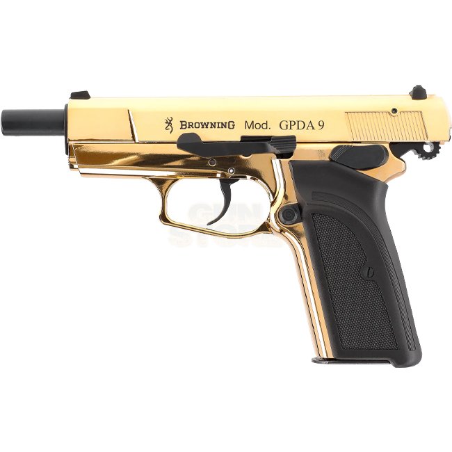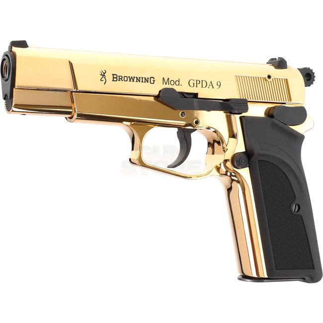 High-quality Browning GPDA9 9mm P.A.K. - Gold pistol with metal construction and plastic grip cover. Comes in semi-auto shooting mode, 9-round magazine capacity, 194mm length, and 885g weight. Package includes gun, magazine, cleaning brush, and case.