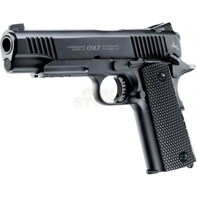 Colt M45 CQBP Black Co2 4.5mm BB with Co2 12g Blowback system, metal body and plastic grip cover, 19 round magazine capacity, 220mm length, 930g weight, 120mm inner barrel, 1.6-1.8J muzzle energy, Semi Auto shooting mode. Package includes gun and magazine