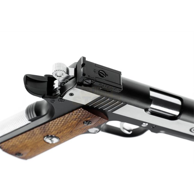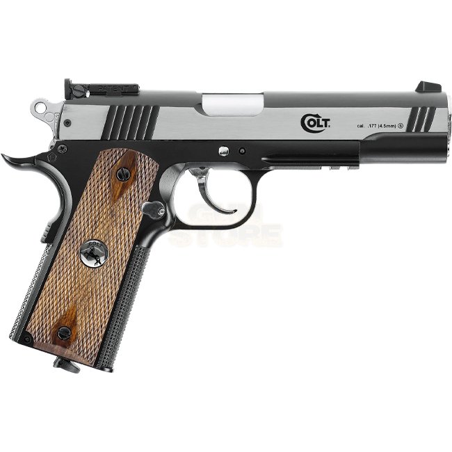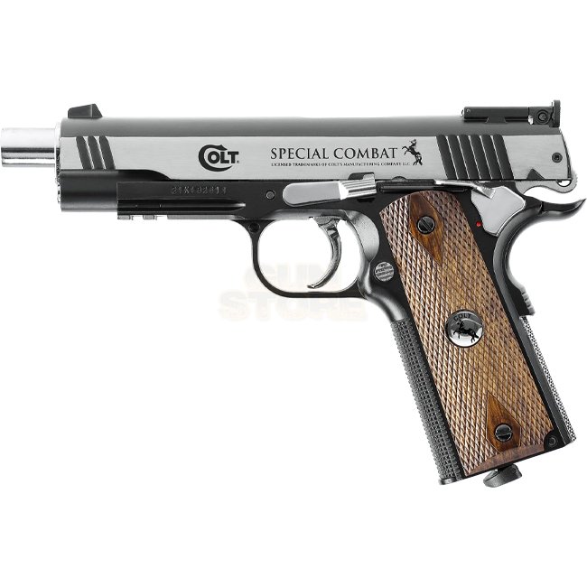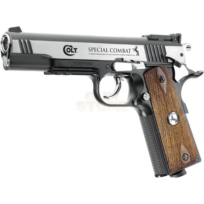 Get ready for action with the Colt Special Combat Dark Ops 4.5mm BB pistol. This dual-tone gun features Co2 12g Non-Blowback system, metal/plastic stock, and a 19 round magazine capacity. Its compact size, with a length of 218mm and weight of 928g, combin