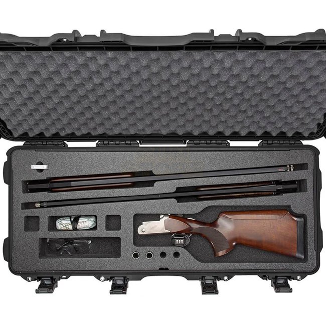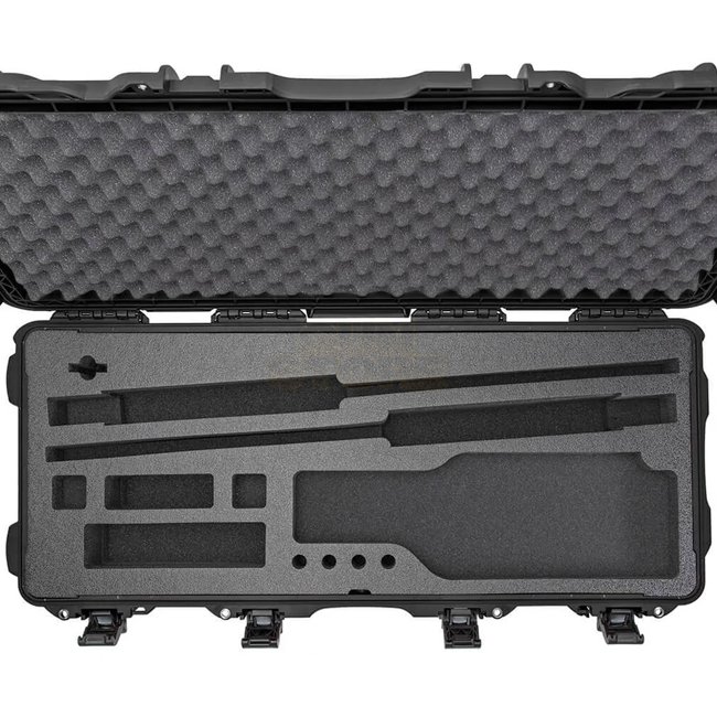 Long, heavy-duty case constructed from NK-7 resin with the PowerClaw locking system, automatic pressure-release valve, soft-grip handle, spring-loaded side handles and polyurethane wheels. The factory TAKEDOWN foam insert (closed-cell) is purpose-shaped to hold disassembled takedown shotguns and related accessories.