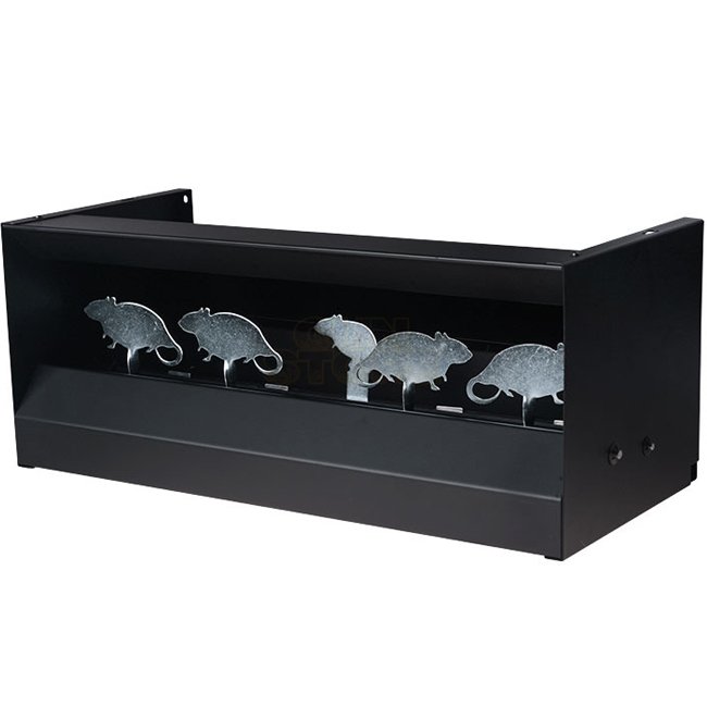 Four standing targets made of steel. If you hit the round target in the middle, all targets line up again. The conical housing intercepts and collects the projectiles. The targets are intended for pneumatic sport air guns as well as recreational air guns and can also be used with Airsoft replicas.