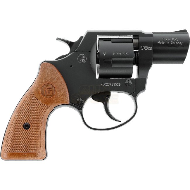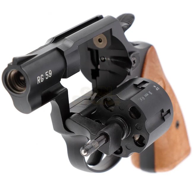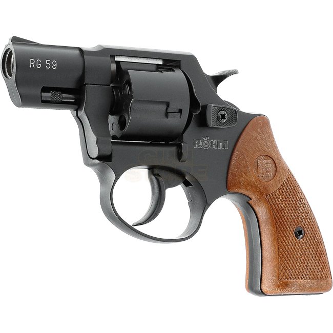 Röhm RG59 9mm R.K. - Black: Metal grip with plastic cover, magazine capacity 5 rounds, compact size at 155mm, weighs 462g, offers Single/Double Action mode. Package includes gun, cleaning brush, and case.