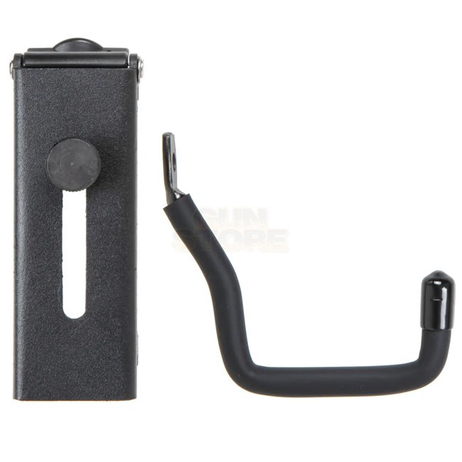 Hook Weapon Hanger, compatible with the Specna Arms and Savior Equipment Wall Panel System. Features: • One Adjustable Hook included • Micro height-adjustable • Rated to hold up to 11kg • Material: Steel (Powder-coated) Dimensions: Mounting Bracket: 9 x 3 x 9cm Hook Depth: 12cm Max. height adjustment: 3.5cm