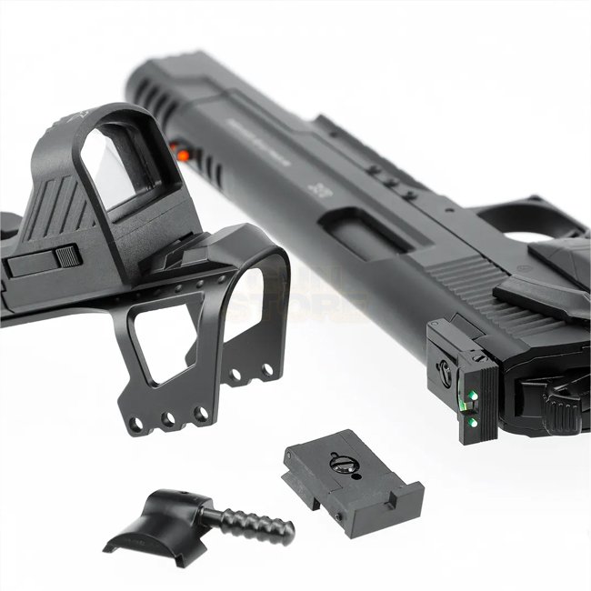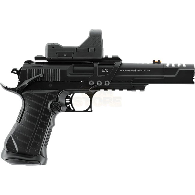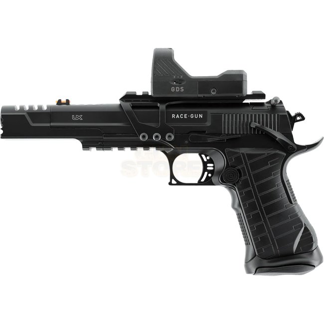 The Umarex Race Gun Kit features Co2 blowback system, metal/plastic construction, 22 round magazine capacity, 267mm length, and 1025g weight. It offers a shooting mode of Semi Auto and includes Umarex GDS Point Sight, mounting rail, and loading lever.