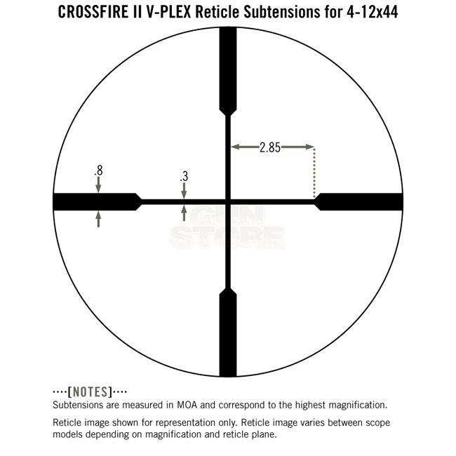 Enhanced Crossfire ll 4-12x44 Riflescope with V-Plex Reticle offers improved performance and durability. Featuring longer eye relief, fully multi-coated lenses, and resettable MOA turrets. Nitrogen purged, o-ring sealed, for waterproof/fogproof reliabilit