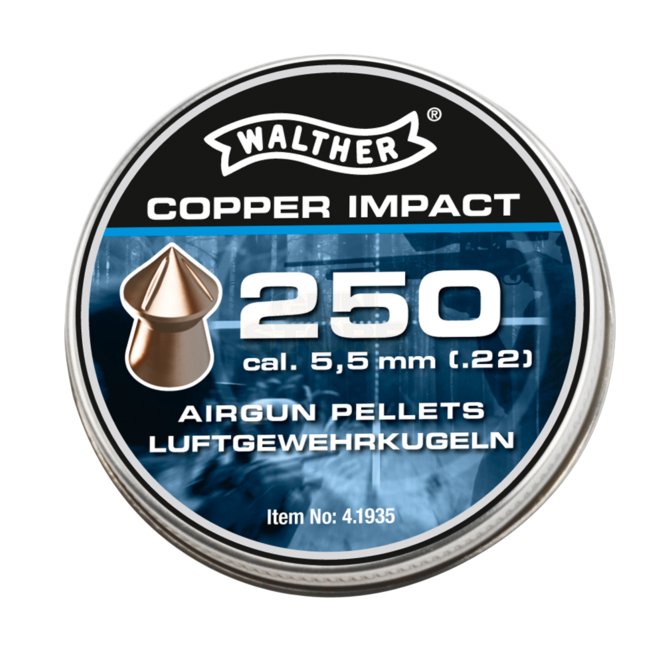 High-quality Walther 5.5mm Pointed Waisted Pellets, 1.04g each, in a pack of 250 rounds. Ideal for accurate shooting and great for target practice.