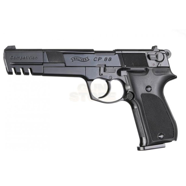 Highly accurate and powerful Walther CP88 Competition Black Co2 4.5mm Pellet pistol. Co2 12g Non Blowback system, metal body with plastic grip, 8-round magazine capacity, compact size at 230mm, and 1150g weight. Offers semi-auto shooting mode and 3.8-4.0J