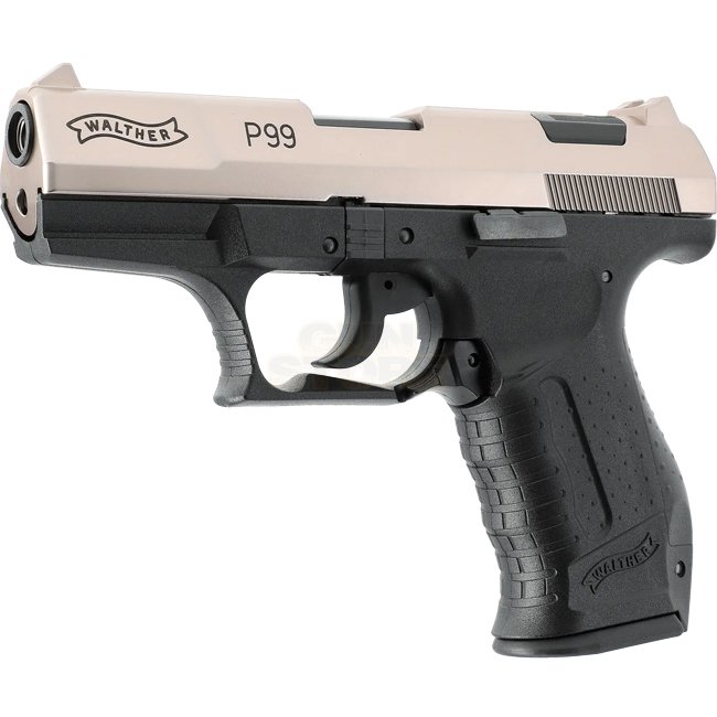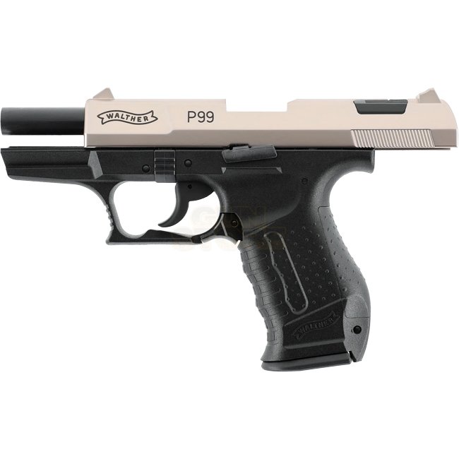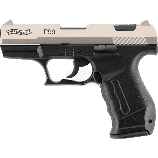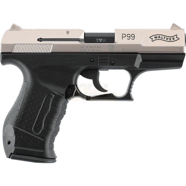 Walther P99 9mm P.A.K. - Dual Tone is a stylish and reliable semi-automatic replica pistol. Made of metal and plastic, it has a magazine capacity of 15 rounds and measures 177mm in length. Weighing 655g, this pistol comes with essential accessories like a