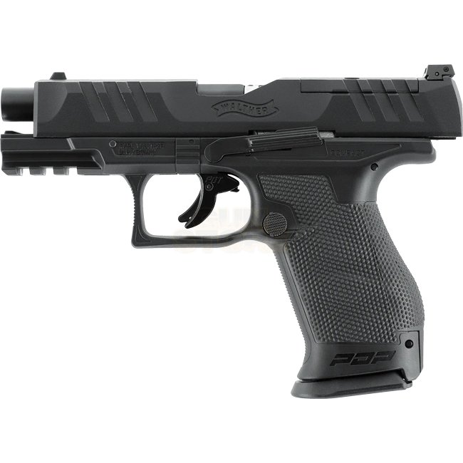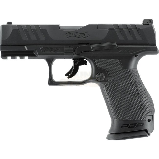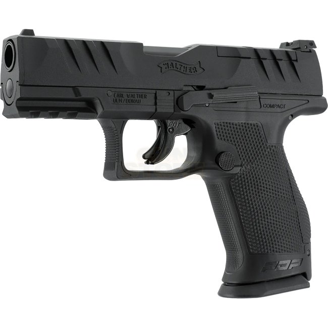 High-quality Walther T4E PDP Compact with Co2 12g Blowback system, metal/plastic build, 8-round magazine capacity, 184mm length, 690g weight, 5.0-5.2J muzzle energy, perfect for Semi Auto shooting mode. Package includes Gun and Magazine.