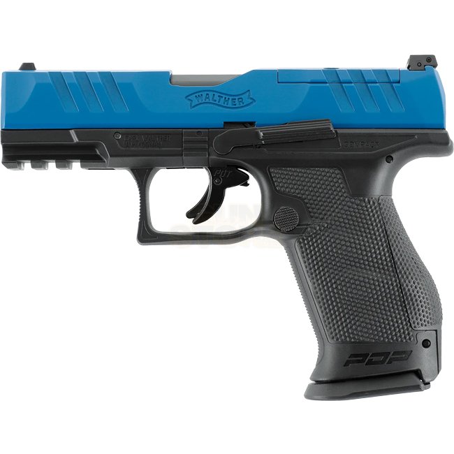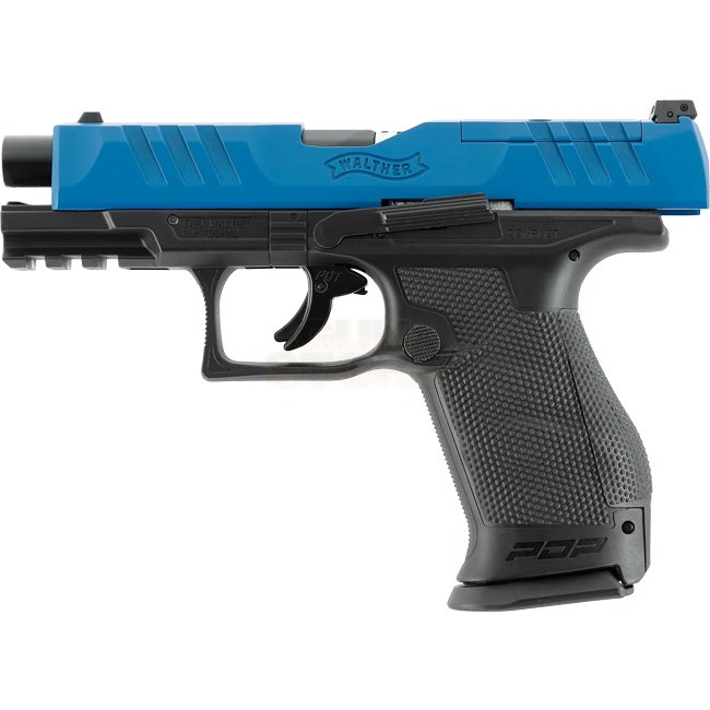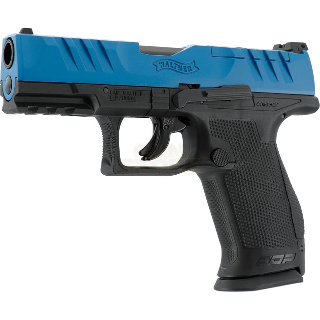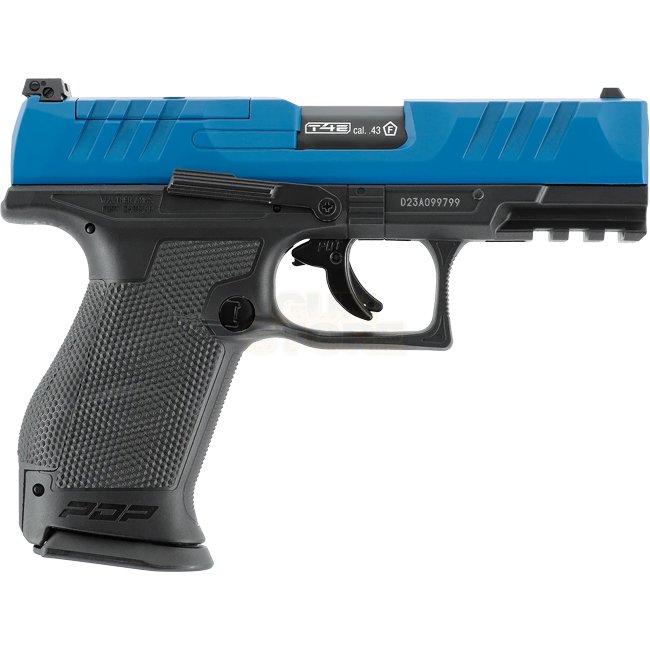 High-performance Walther T4E PDP Compact featuring realistic blowback action and Co2 12g system, with a magazine capacity of 8 .43 rubber balls. Metal/plastic construction, 184mm long, weighing 690g. Semi-auto shooting mode with muzzle energy range of 5.0